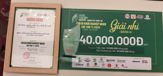 Giải Nhì Bảng A 40 triệu (Dự án Khởi Nghiệp Xanh lần 11-2025) + Giải Nhất 30 triệu (Cuộc thi Sáng Kiến Chuyển Đổi Xanh – Kinh Tế Xanh) = 70 triệu đồng giá trị giải thưởng.